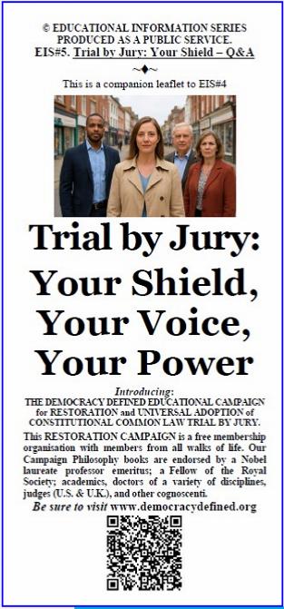 "History will recall that the Mission to achieve Restoration and Universal Adoption of the genuine Trial by Jury is the single most important political activity in the civilised world. The well-being, prosperity, protection and happiness of all people depend upon its successful outcome."
